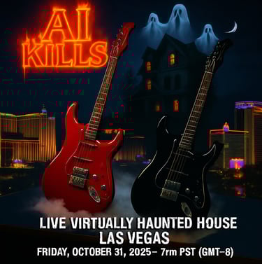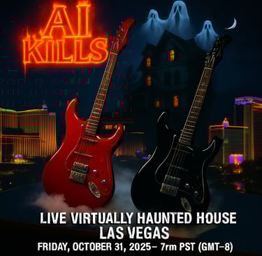 Explore our tour venues, attend, listen and interact live in chat with Todd Russell, the human creative force behind AI Kills. These live concerts are not in person physical events, they are online virtual events.