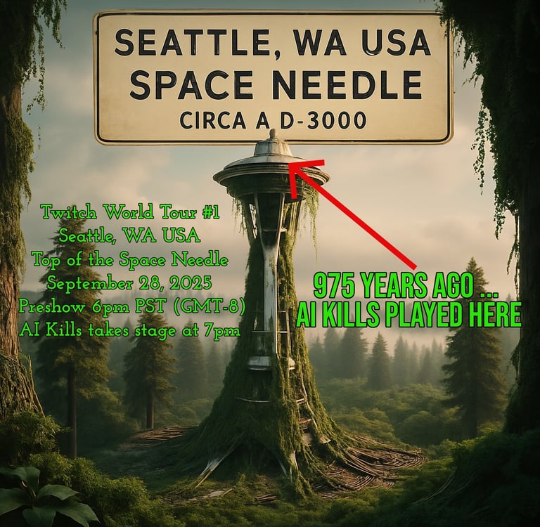 AI Kills was the first AI Band in the world to do a world virtual tour, streamed live on Twitch, in places no traditional artists/bands could ever play like the very top of the space needle on SUnday September 28, 2025. This is merely one of planned 13 dates across 9 countries, including wild, unique locations. AI Kills is all about the imagination, what you can dream, can become reality. We're just getting started, start listening and share with your music loving friends!